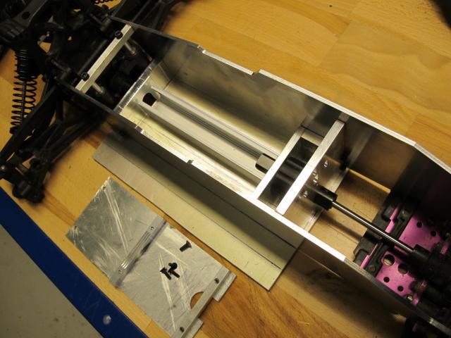 The batteries will rest against the U-shaped alu part in the center line... which will protect dogbone from bats or is it the other way round? 10T pinion fitted on the motor :)
