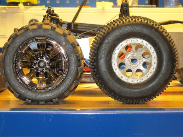 Nixpus> very interesting thread! do you have a pic comparing those two wheel combos ? The axial oversize rims are big, but wondering how big the masher tires are? Are you using a brace by the endbell to support the neu motor ?