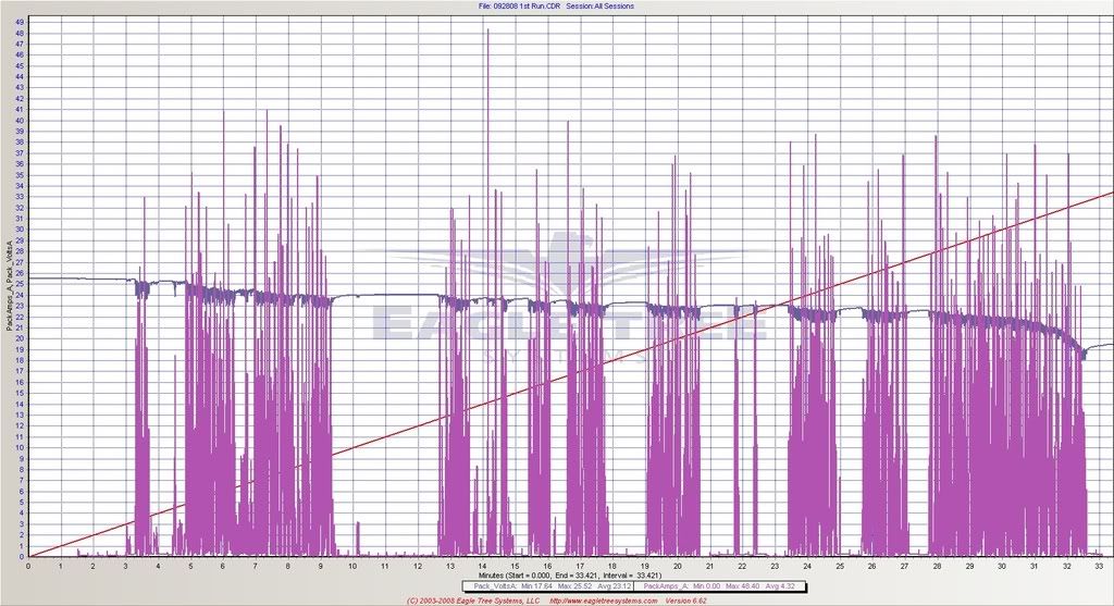 I'm eager to see a graph of your setup without breaks inbetween and also showing Wattage (especially average Wattage). During my rather crazyer days i drove shorter gearings with 10s1p A123 and needed 600 Watt average. I never was able to use all this power on a track which is why i experimented with gearing and cell count and came to the conclusion that 9s1p and a 1:13,8 gearing gives me just about the right performance to be competitive -> average Wattage is now down to 350 Watt.