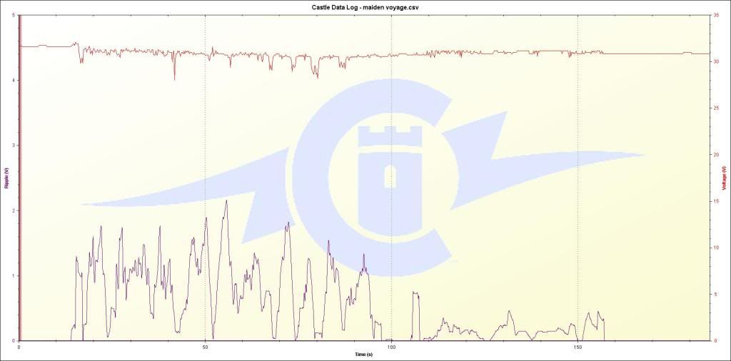 To calculate ripple from the Castle Data Log Viewer...I took Max voltage 33.5 volts divided by Max ripple of 2.53 volts. That gave me a ripple of about 7.5% based on 33.5volts or 6.3% based on 34 volts. Is this correct to us Max volt numbers? Also I noticed the peak ripple is for only for an instant...So am I ok on ripple? Do I use 33.5 or 34 as the max...or does that matter so much? I am either 6.3% or 7.5%