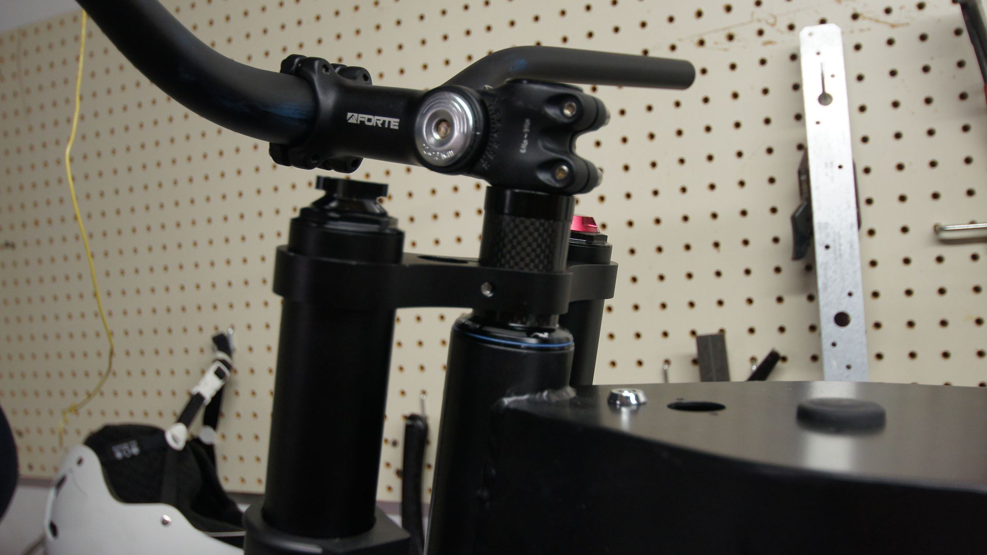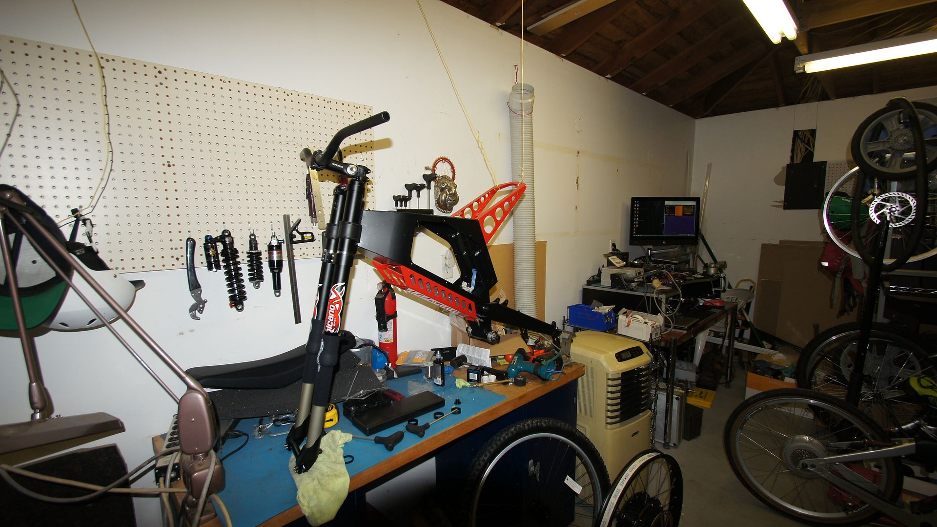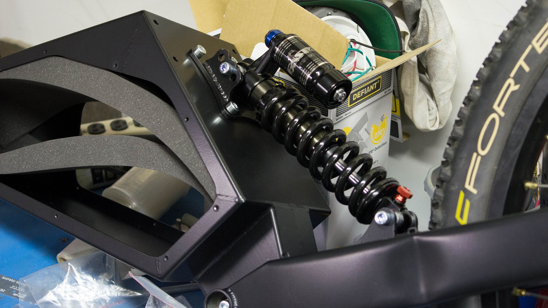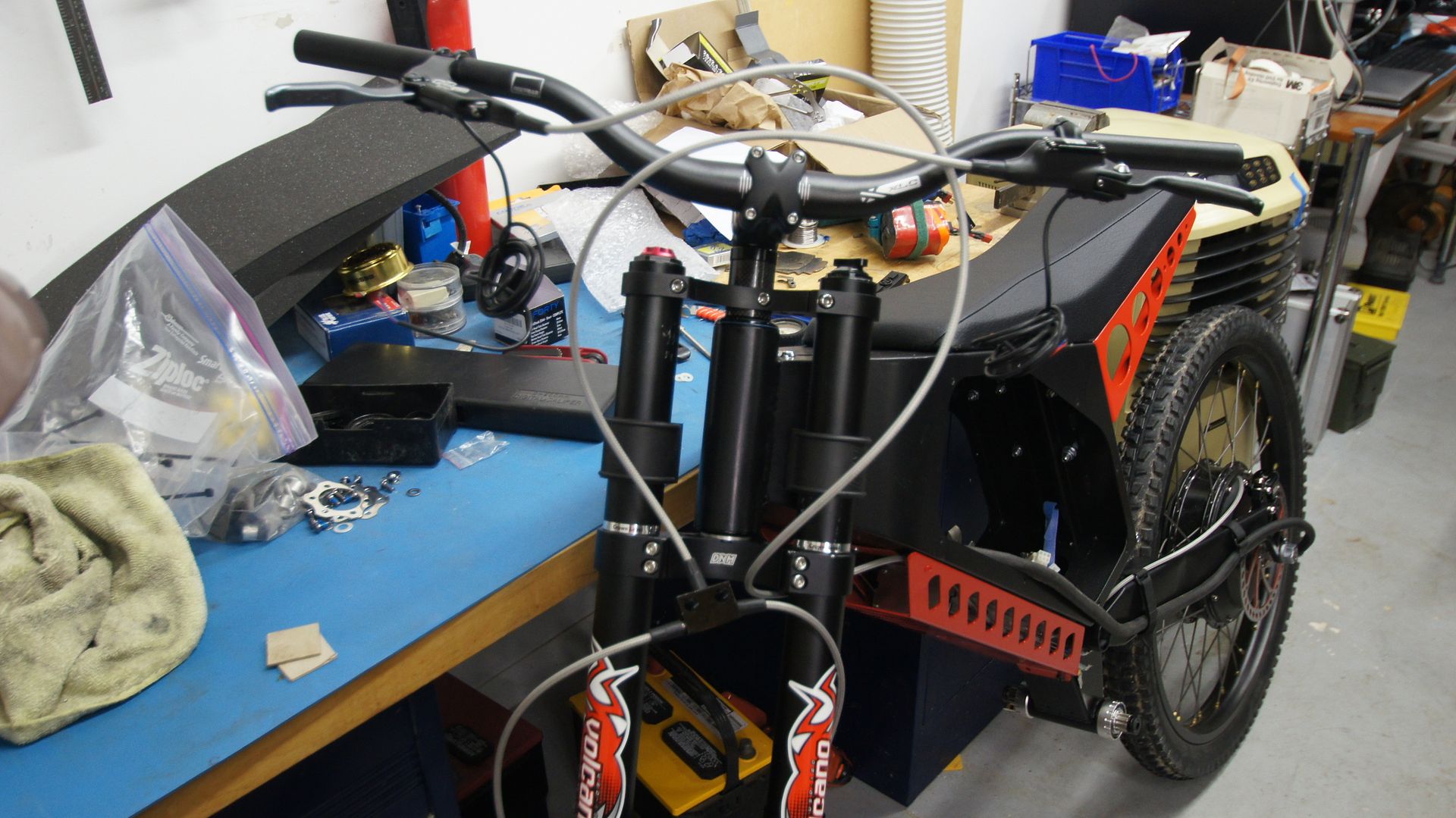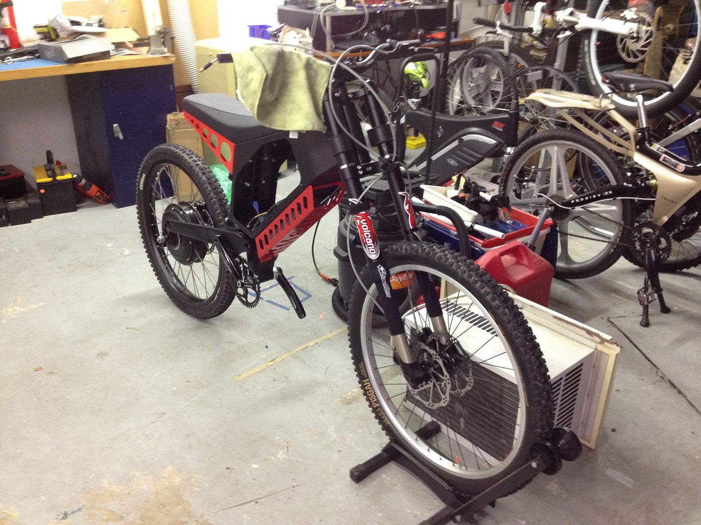 The frame looks pretty radical for a bicycle. Looks more like a motocross frame. Very nice setup, but with the weight I am surprized that you are not going with front and rear motors to give yourself more torque and easier hill climing. That would help to keep the stress and heat lower on anyone motor or controller.