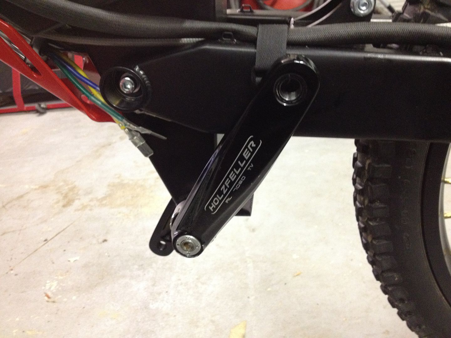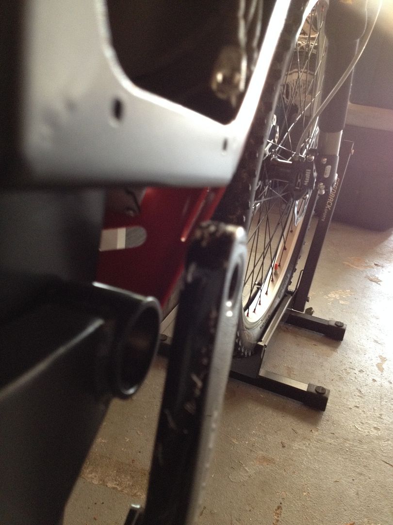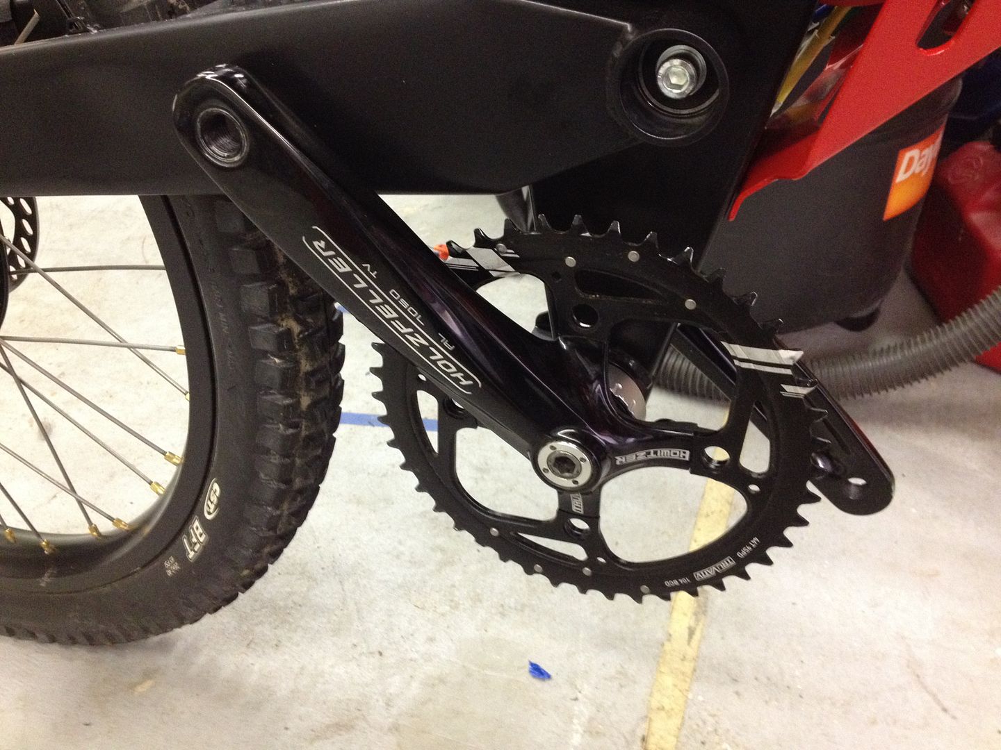 Installed an old set of 165mm cranks. Still need to look for a new rear brake, as the the one I have is leaking oil. The front brake lines are find, but need to install some spacers between the brake rotors.