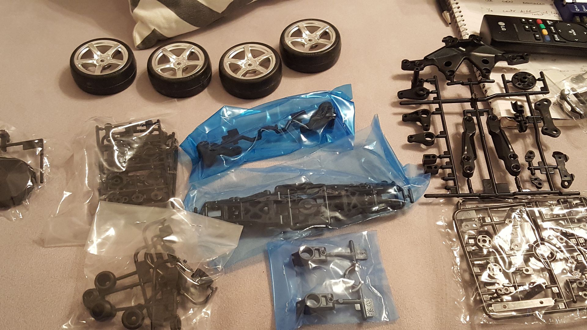 1st thing, this is a nice kit, and while the bulk of the hardware is Philips drive, it is mainly fine/machine thread. Parts fit is typical tamiya, so very nice. As always, the molding quality is stellar. This kit comes with shielded ball bearings for the trans and wheels. Also comes with the CVA oil filled shock kit. Lots of parts, so this will be an involved build, just adding to the fun!